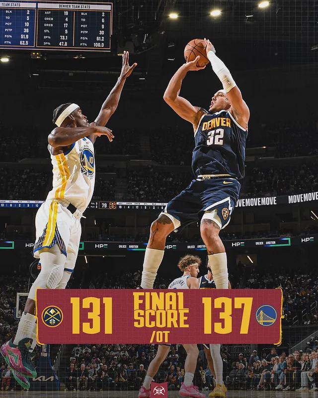 第四节还剩26.7秒,戈登45度大心脏三分,帮助掘金领先3分。21.4秒,库里飙进逆天绝平三分,成功拖入加时。戈登投篮21中17,三分11中10,罚球6中6,狂轰50分8篮板2助攻1盖帽!单场50分,创造掘金队史揭幕战最高纪录。